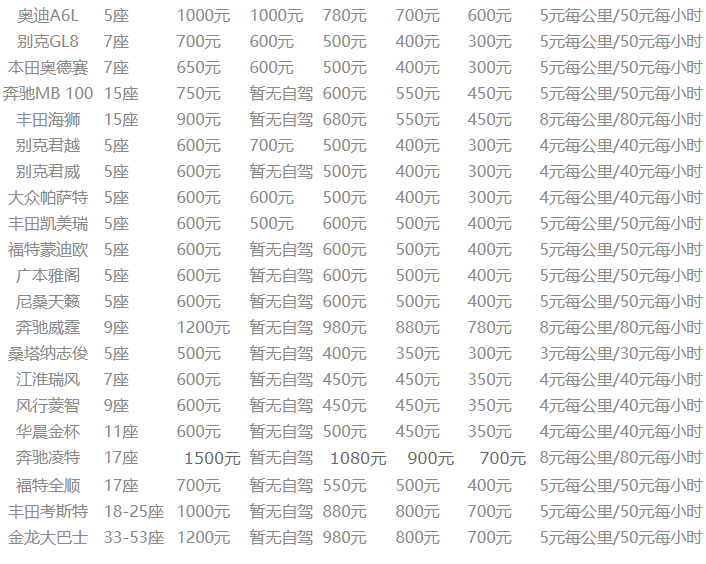 特别备注:以上报价仅供参考,因本公司是连锁区域不同,价格具体以实际用车为准。